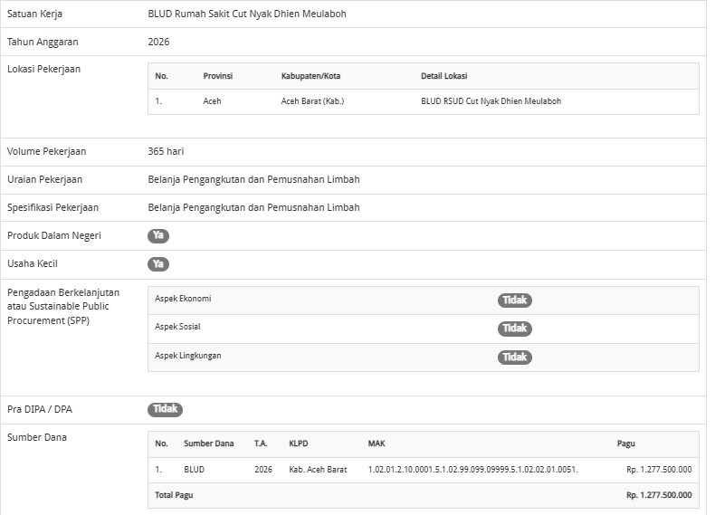 Dikutip dari lama SiRUP pada Senin (2/3/2026), pengadaan ini berada di bawah kewenangan Pemerintah Kabupaten Aceh Barat melalui satuan kerja BLUD RSUD Cut Nyak Dhien Meulaboh. Kegiatan direncanakan berlangsung selama 365 hari, mulai Januari hingga Desember 2026.
