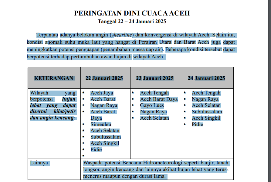 Wilayah yang berpotensi hujan lebat yang dapat disertai kilat atau petir dan angin kencang pada 22 Januari 2025 meliputi Aceh Jaya,Aceh Barat, Nagan Raya, Aceh Barat Daya, Simeuleu dan Aceh Selatan, Subulussalam, Aceh Singkil, Pidie.
