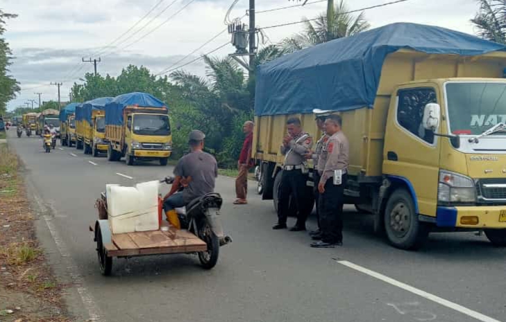 Sudutpenanews.com, Aceh Barat : Puluhan mobil pengangkutan truk batu bara pengguna jalan umum lintas Kabupaten Aceh Barat tertahan dijalan Letnan Mubin Kecamatan Johan Pahlawan Kabupaten setempat, Jum’at (17/1/2025).