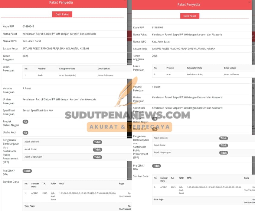Dari data yang tercantum, kedua paket memiliki total pagu yang sama, yakni Rp594.550.000, dengan volume pekerjaan 1 paket, lokasi pekerjaan di Kabupaten Aceh Barat (Kecamatan Johan Pahlawan), serta sumber dana dari APBD Aceh Barat 2025. Jika digabungkan, pengadaan mobil operasional Satpol PP dan WH Aceh Barat mencapai Rp. 1.189.100.000.