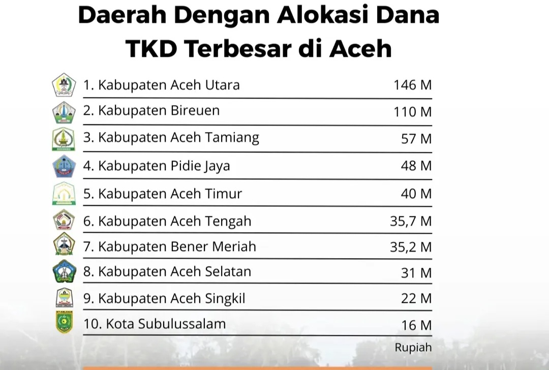 Berdasarkan data yang dihimpun, Kabupaten Aceh Utara menjadi daerah dengan alokasi terbesar, yakni mencapai Rp146 miliar. Disusul Kabupaten Bireuen sebesar Rp110 miliar, dan Kabupaten Aceh Tamiang sebesar Rp57 miliar.