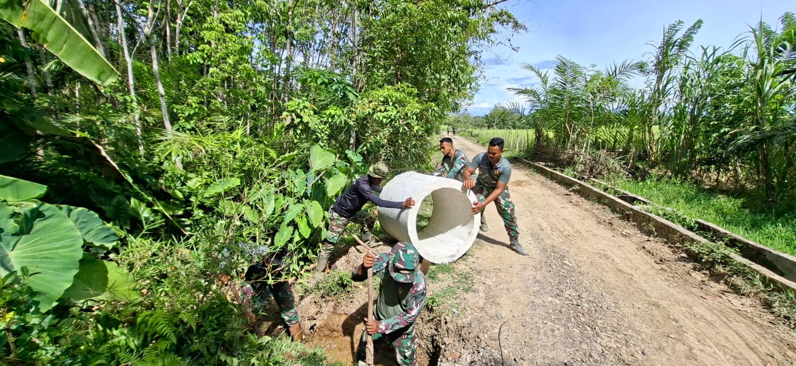 Pemasangan gorong-gorong ini bertujuan untuk memastikan kelancaran aliran air menuju lahan pertanian dan perkebunan milik warga. Di bawah terik matahari, personel Satgas dan masyarakat tampak kompak bahu membahu menurunkan material, mengatur posisi cincin, hingga melakukan penimbunan dan perapian badan jalan.