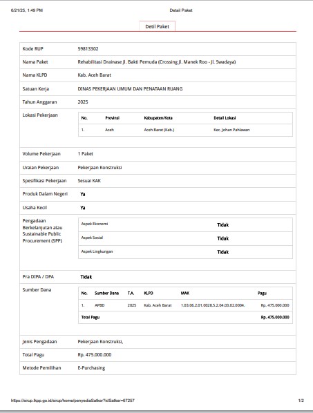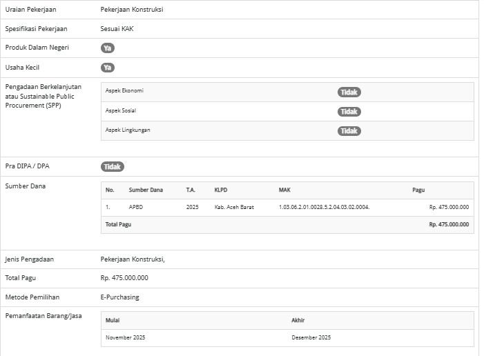 berdasarkan data sirup.lkpp.go.id Sabtu (21/6/2025), Paket pekerjaan konstruksi ini teregister dengan Kode RUP 59813302 dan direncanakan akan dilaksanakan menggunakan dana dari Anggaran Pendapatan dan Belanja Daerah (APBD) Kabupaten Aceh Barat tahun 2025.