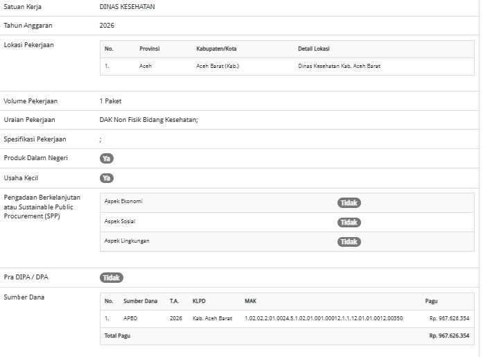 Dikutip dari laman SiRUP Selasa (17/3/2026), berdasarkan data Rencana Umum Pengadaan (RUP) dengan kode 66293300, paket tersebut memiliki pagu anggaran sebesar Rp967.626.354 pada Tahun Anggaran 2026. Pengadaan ini tercatat sebagai jenis pengadaan barang dan direncanakan menggunakan metode e-purchasing, dengan sumber dana berasal dari APBD Kabupaten Aceh Barat yang terkait dengan program DAK Non Fisik Bidang Kesehatan.
