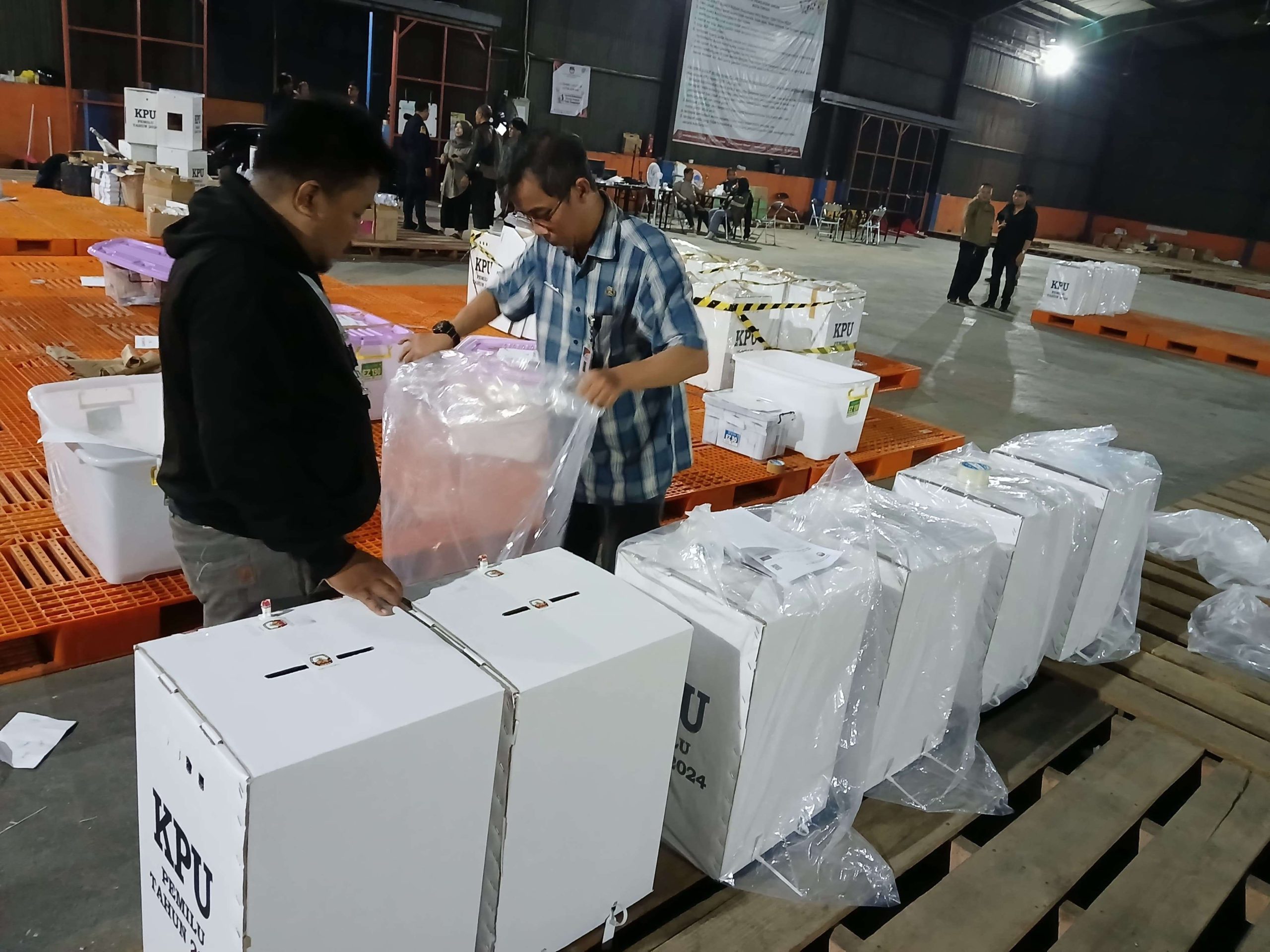 Petugas KPU tengah menyiapkan logistik Pemilu yang akan digunakan pada pemungutan suara ulang (PSU) dan Pemilu lanjutan di Gudang Bulog Kota Cimahi, Minggu (18/2/2024). (Foto: Dokumentasi Bawaslu)