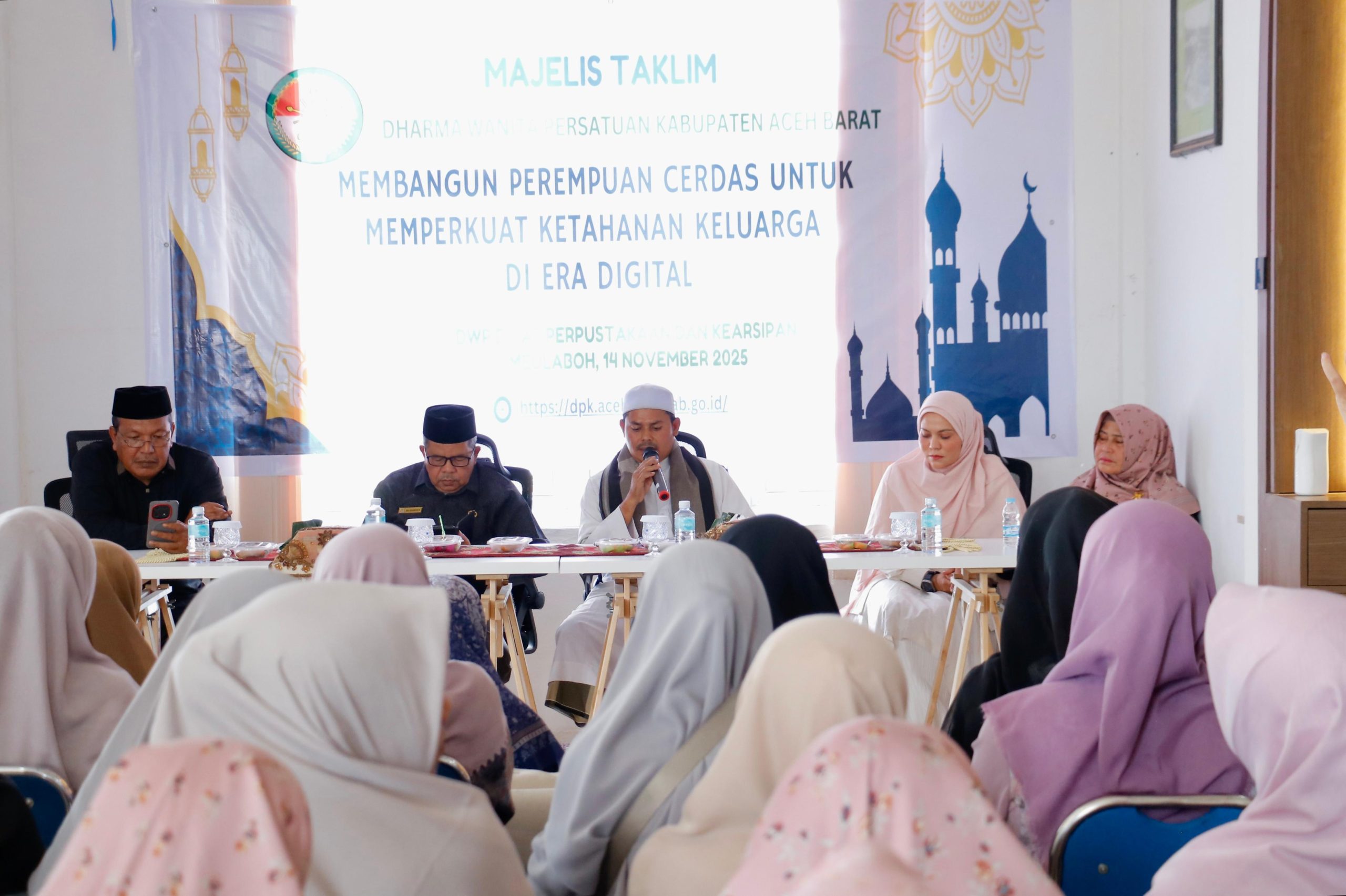 Aceh Barat | Sudutpenanews.com : Dharma Wanita Persatuan (DWP) Kabupaten Aceh Barat melaksanakan kegiatan majelis taklim di Kantor Dinas Perpustakaan dan Kearsipan Kabupaten Aceh Barat, Jumat (14/11/2025). Kegiatan ini mengusung tema “Membangun Perempuan Cerdas untuk Memperkuat Ketahanan Keluarga di Era Digital.”