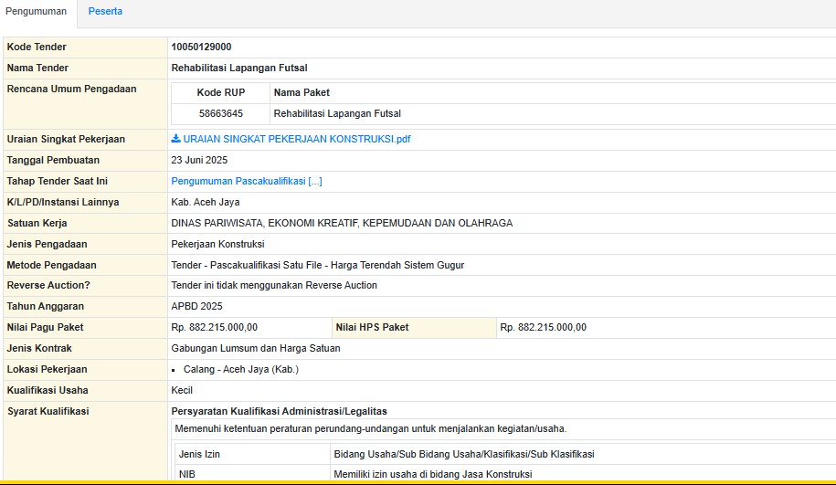 Sudutpenanews.com, Aceh Jaya – Pemerintah Kabupaten Aceh Jaya melalui Dinas Pariwisata, Ekonomi Kreatif, Kepemudaan dan Olahraga resmi mengumumkan tender pekerjaan konstruksi Rehabilitasi Lapangan Futsal di Calang, Aceh Jaya. Tender ini merupakan bagian dari pengadaan yang bersumber dari Anggaran Pendapatan dan Belanja Daerah (APBD) Tahun 2025 dengan pagu anggaran senilai Rp882.215.000.