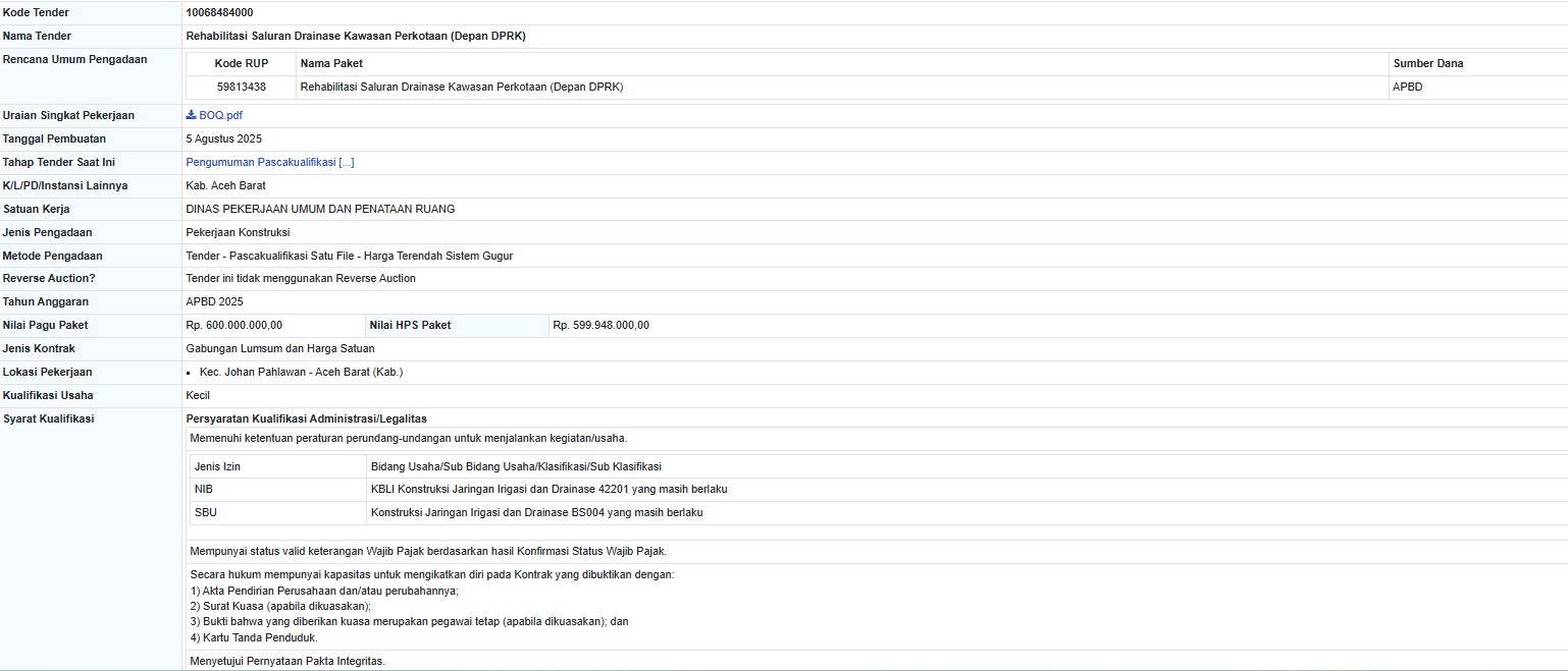 Aceh Barat | Sudutpenanews.com : Pemerintah Kabupaten Aceh Barat melalui Dinas Pekerjaan Umum dan Penataan Ruang (PUPR) membuka tender pekerjaan rehabilitasi saluran drainase kawasan perkotaan yang berada di depan gedung DPRK Aceh Barat. Proyek ini memiliki pagu anggaran sebesar Rp 600 juta, bersumber dari APBD tahun anggaran 2025.