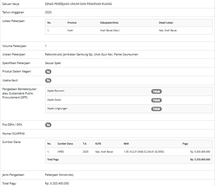 berdasarkan data sirup.lkpp.go.id Sabtu (21/6/2025), Pekerjaan konstruksi tersebut tercatat dengan Kode RUP 59274018 dan menggunakan sumber dana dari Anggaran Pendapatan dan Belanja Daerah (APBD) Kabupaten Aceh Barat tahun 2025.