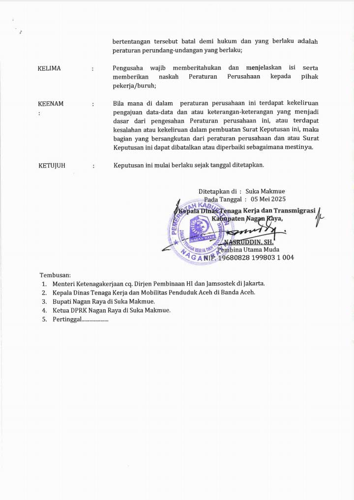 Nasir, Ketua Serikat berharap Disnaker Nagan Raya dapat meninjau kembali keputusan tersebut dan memberikan kesempatan bagi kedua belah pihak untuk melakukan pembahasan ulang terhadap isi Peraturan Perusahaan yang telah disahkan.