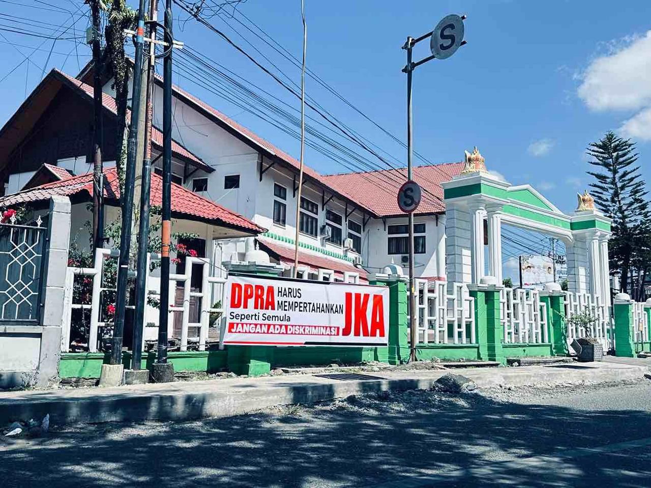 Sudutpenanews.com | Aceh Barat — Sejumlah spanduk bertuliskan “DPRA Harus Mempertahankan JKA Seperti Semula, Jangan Ada Diskriminasi” terpantau terpasang di beberapa titik di Kabupaten Aceh Barat, Sabtu (18/4/2026).