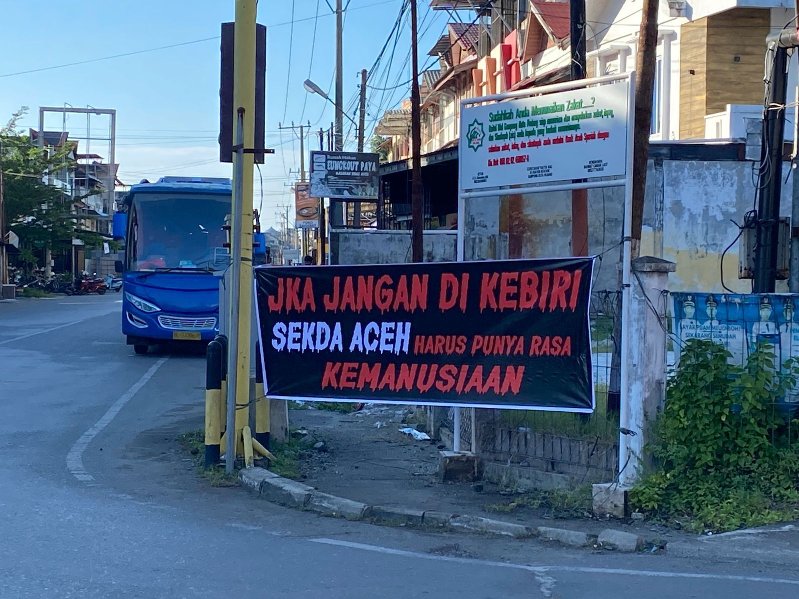 Berdasarkan pantauan sudutpenanews.com,Sabtu (18/4/2026), sedikitnya dua lokasi di wilayah Meulaboh yang terlihat memasang spanduk tersebut yakni di depan Kantor DPRK Aceh Barat dan kawasan Simpang Armada. Spanduk dengan latar putih dan tulisan mencolok itu dipasang di area yang mudah terlihat oleh pengguna jalan.