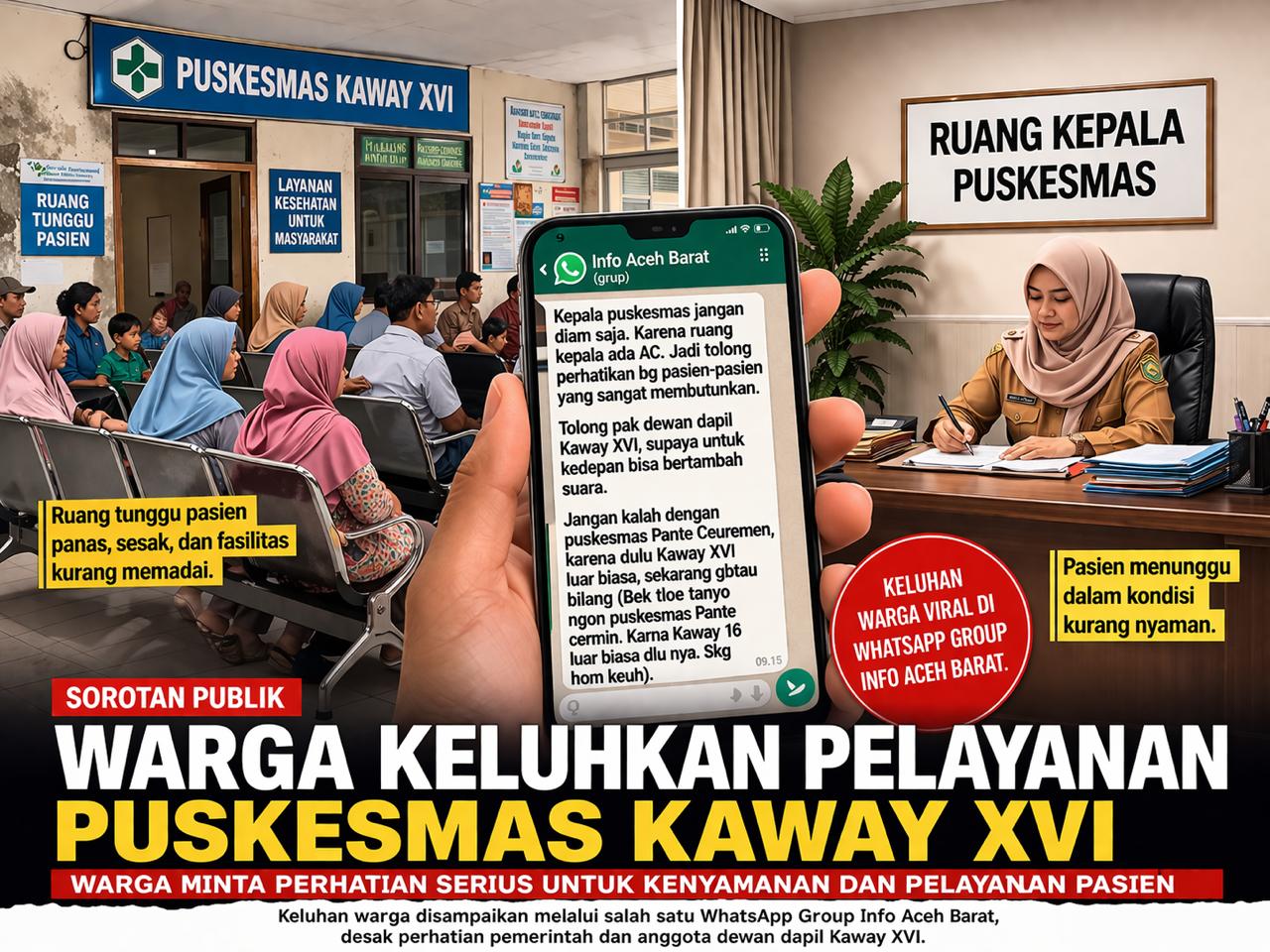 Sudutpenanews.com  |Aceh Barat – Seorang warga menyampaikan keluhan terkait pelayanan di Puskesmas Kaway XVI yang dinilai belum maksimal, terutama dalam hal kenyamanan bagi pasien. Keluhan tersebut disampaikan melalui salah satu grup WhatsApp Info Aceh Barat, Sabtu (4/4/2026), dan menjadi perhatian publik.